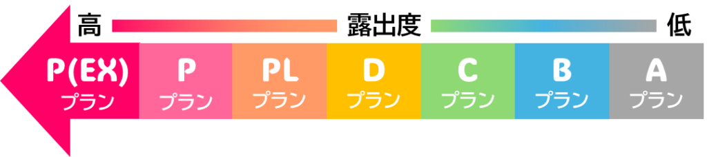 | 掲載日数 | P(EX)プラン (1枠) | Pプラン (1枠) | PLプラン (1枠) | Dプラン (1枠) | Cプラン (1枠) | Bプラン (10枠) | Aプラン (10枠) |